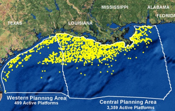 Giant oil rigs are found in hundreds of locations in the western Gulf, and more have been approved—but none within 125 miles of Florida beaches. (Wikimedia)