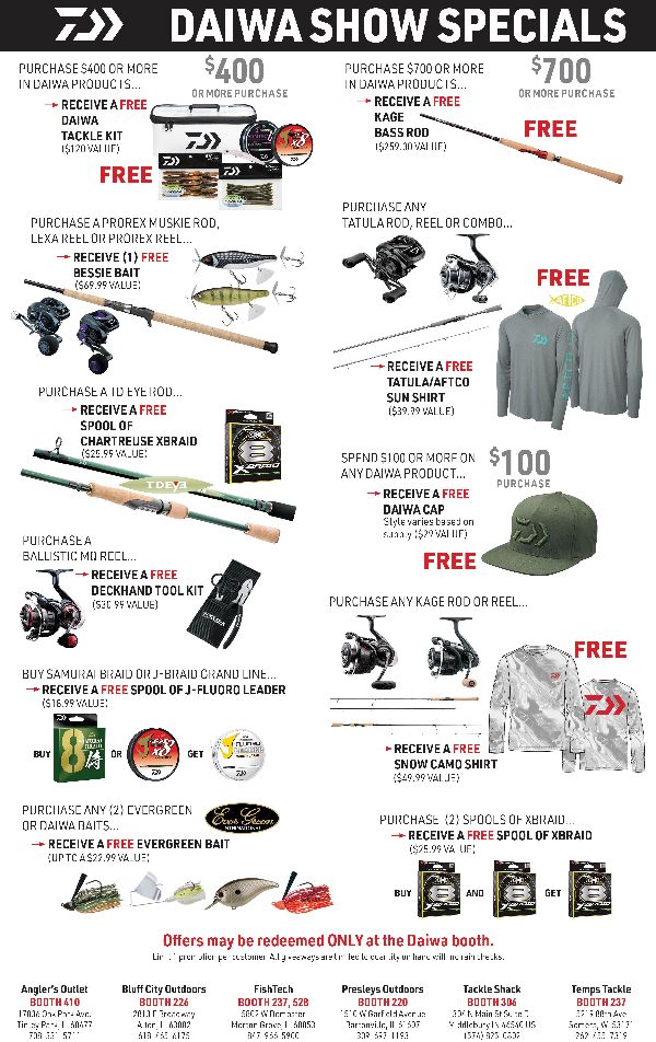 Once again, a long list of show specials are being offered when purchasing DAIWA gear from exhibiting dealers at the show, including Angler's Outlet, Bluff City Outdoors, FishTech, Tackle Shack and Temps Tackle.