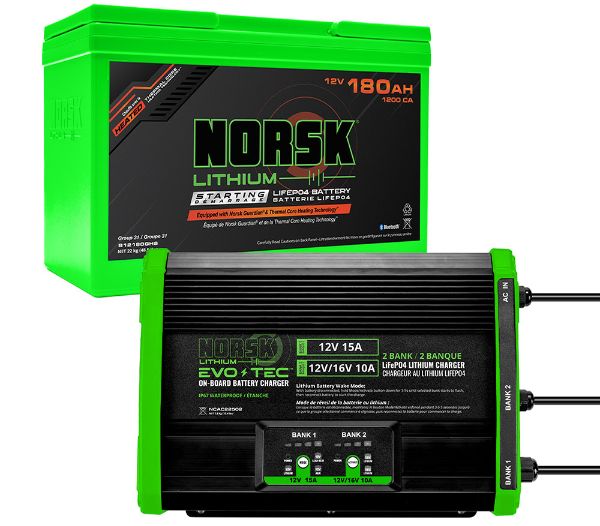 The 180Ah Wheelhouse Power Package delivers reliable, all-day lithium power for wheelhouses, skid houses, and crank houses. Featuring a Norsk Lithium 180Ah starting battery, this package powers 12V equipment and provides 120V power to outlets through a separate inverter (not included), with stable performance, and complete monitoring through the free Norsk Guardian® App. The 2 Bank EVO-TEC™ On-Board Charger delivers up to 25A for fast recovery and dependable charging.