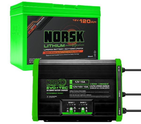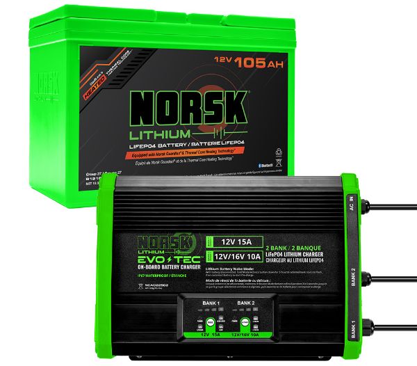 The 105Ah Wheelhouse Power Package provides efficient lithium power for wheelhouses, skid houses, and crank houses. Featuring a Norsk Lithium 105Ah Deep-Cycle Battery, this package powers 12V equipment and supplies 120V outlet power through a separate inverter (not included), with reliable cold-weather performance and complete monitoring through the free Norsk Guardian® App. The 2-bank EVO-TEC™ On-Board Charger delivers up to 25A for fast recovery and dependable charging.