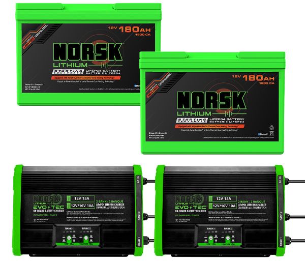 The 360Ah Ultimate Wheelhouse Power Package delivers a complete lead acid replacement solution for permanent ice houses running hydraulic systems. Featuring two Norsk Lithium® 180Ah cranking batteries wired in parallel, this package provides 360 amp hours of stable 12V power and reliable cold weather hydraulic performance all season long, with complete system monitoring through the free Norsk Guardian® App. The two 12V EVO-TEC™ 2 Bank On-Board Chargers deliver up to 25A per battery for fast recharge rates and dependable charging in demanding winter conditions.