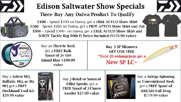 Exclusive show incentives include a Free Bulk Spool of 50# J-Braid® X4 with any electric reel purchase and a Complimentary DAIWA Deckhand Tool Kit with the purchase of any MQ-series spinning reel (SALTIST, Ballistic, or BG).