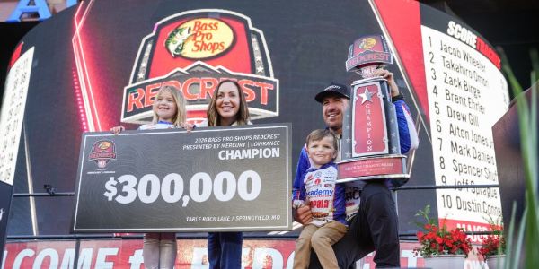 SPRINGFIELD, Mo. – With 2 ½ hours left to fish in Bass Pro Shops REDCREST Presented by Mercury & Lowrance, Jacob Wheeler sat on the front deck of his bass boat and made a phone call. Trying to distract himself from the fact that the $300,000 prize and REDCREST trophy that had long eluded him were within reach, Wheeler FaceTimed his wife, Alicia, and their two children, Olivia and Hudson, during the final period break.