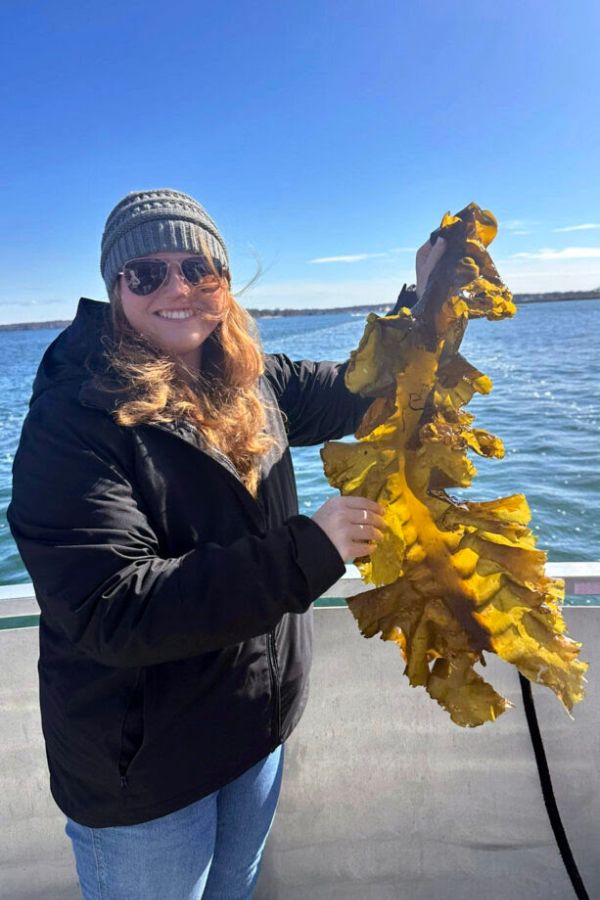 Taylor Kilgore, a marine educator with the Mississippi-Alabama Sea Grant Consortium and Dauphin Island Sea Lab Discovery Hall Programs, holds sugar kelp during a site tour as part of the aquaculture academy in 2025. (Photo courtesy of Taylor Kilgore)