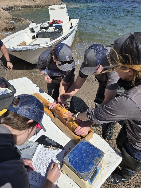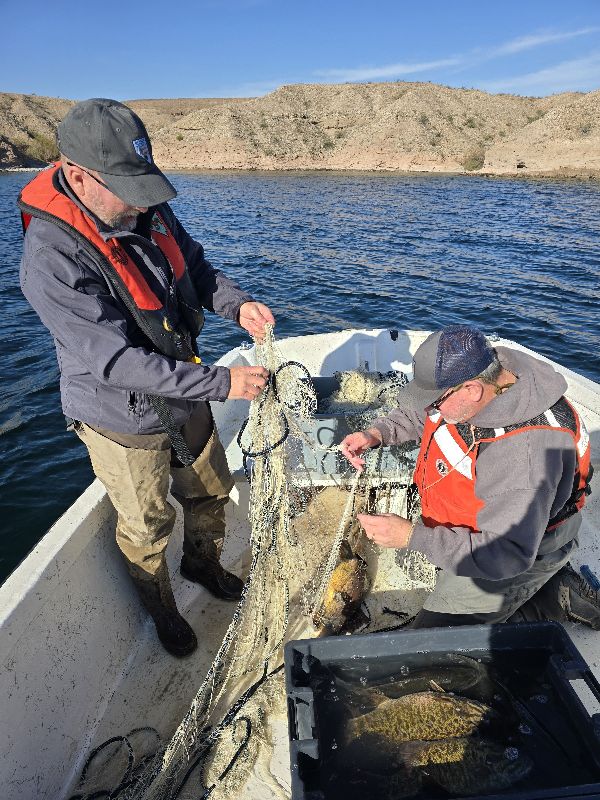 Each year the Nevada Department of Wildlife (NDOW) gathers a team of people led by Fisheries Division staff to help conduct Razorback Sucker surveys at Lake Mohave and lovingly refer to this project as the "Razorback Roundup". This annual survey helps the Department assess how razorbacks are doing at Lake Mohave. All fish that are caught are weighed and measured (striped bass (striper), smallmouth bass, largemouth bass, razorback suckers). Razorback suckers that are caught are weighed and measured and are also given PIT (Passive Integrated Transponder) tag if they don't already have one. These are small, uniquely identifiable microchips that are used across the country to help biologists monitor fish movement, assess population size and identify individual fish.