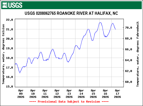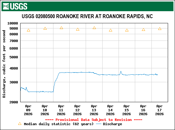 An early striped bass spawning season is unfolding on the Roanoke River, driven by low flows and warm spring temperatures across the basin. Flows at the USGS gage near Roanoke Rapids are averaging about 3,500 cubic feet per second (cfs), below the historically optimal spawning range of 6,000–8,000 cfs. With limited rainfall so far this year, river flows have remained low.