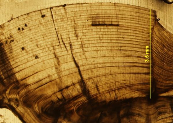 A sectioned red drum otolith. Photo by William Jones via EarthRef.org