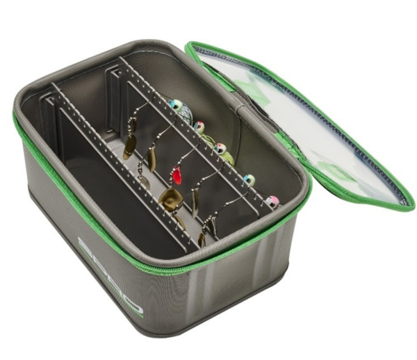 Soft-sided boxes are becoming anglers' choice for adding to their tackle storage options. Tournament anglers are picking this option over hard boxes when it comes to tackle selections when they are getting set up to join another angler in their boat in pre-fishing or tournament conditions. The SPRO Soft Sided 3700 box accommodates a wide range of tackle, allowing anglers to see bait choices through the clear-view window for faster tackle selection. Water-resistant, zipper-open and close allows for fast and easy tackle selection and storage.