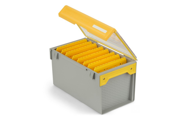 EZ Label labeling system with pre-cut and pre-separated vented dividers for customized and safe tackle organization.