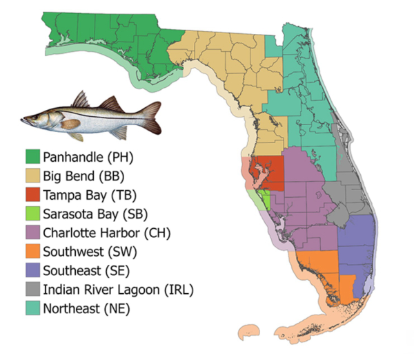 The regional management regions are part of the Florida Fish and Wildlife Conservation Commission’s (FWC) holistic management approach for Florida’s most popular inshore fisheries. This approach uses seven metrics to evaluate the fishery by region, allowing the FWC to be more responsive to local concerns. To learn more, visit MyFWC.com/Snook. This page includes the snook annual reviews, which provide summaries of key findings from the annual evaluation of management metrics for each region.