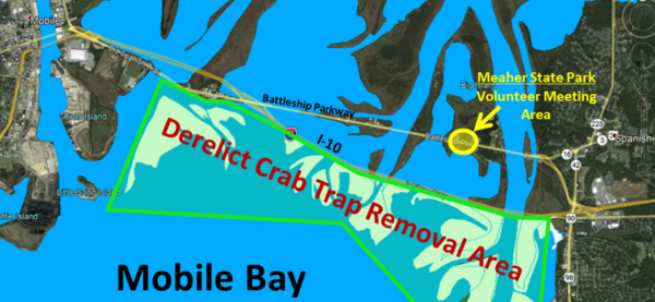 On Saturday, October 25, small shallow-draft powered vessels will be needed to collect and deliver the derelict crab traps to the disposal site located at Meaher State Park.