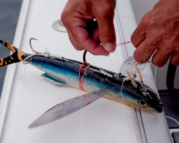 They will fish several versions of imitation flying fish or a rig consisting of a skewered dead flying fish, 9/0 J-Hook, and 5/O treble hook. A crimp connects the hooks with 400 lb Seaguar Big Game Blue Label fluorocarbon leader material, which has the abrasion resistance to stand up to long fights with massive tuna.